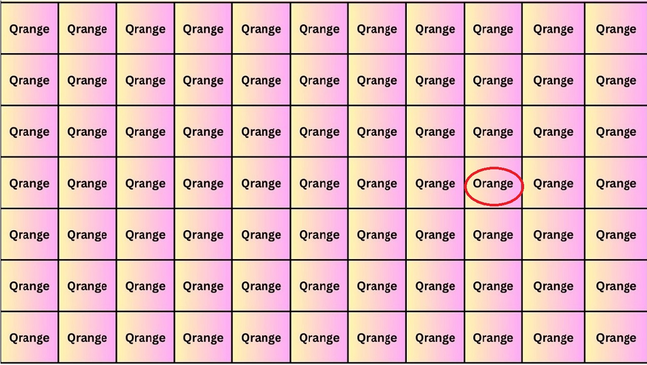 This brain teaser looks easy at first, but it’s not. Most people get confused because their eyes quickly get used to seeing “Qrange” everywhere. The brain starts ignoring small differences and thinks every word is the same. That’s why only a few people with really quick and careful eyes can spot the hidden “Orange” right away.