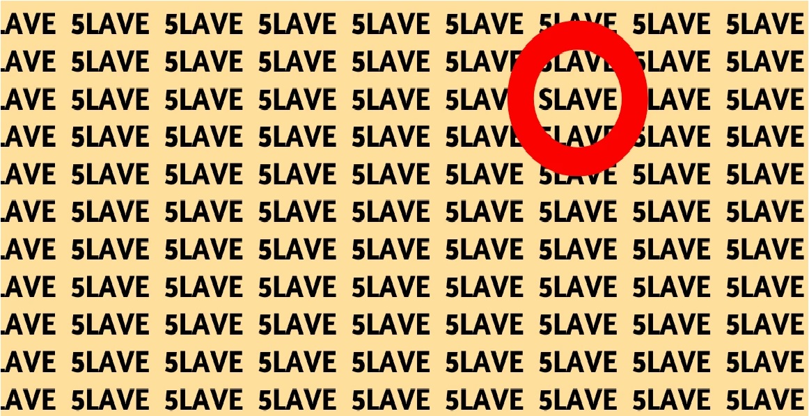 The real challenge is to find the one word that is written correctly as “SLAVE” with the proper letter S, not the number 5. You need to look very carefully and scan the entire image row by row or section by section. Don’t rush or jump your eyes randomly. A calm and steady look often helps more.